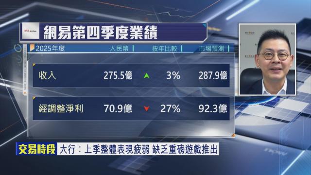 【Now財經台】網易(09999)昨日(11日)出咗去年第4季業績,經調整盈利按年跌27%,差過預期,但摩根大通形容,網...(09999) 【分析】 植耀輝 2026/02/12 16:09
