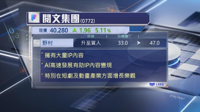 【Now財經台】野村上調閱文集團(00772)評級及目標價。(00772) 【分析】 22小時前