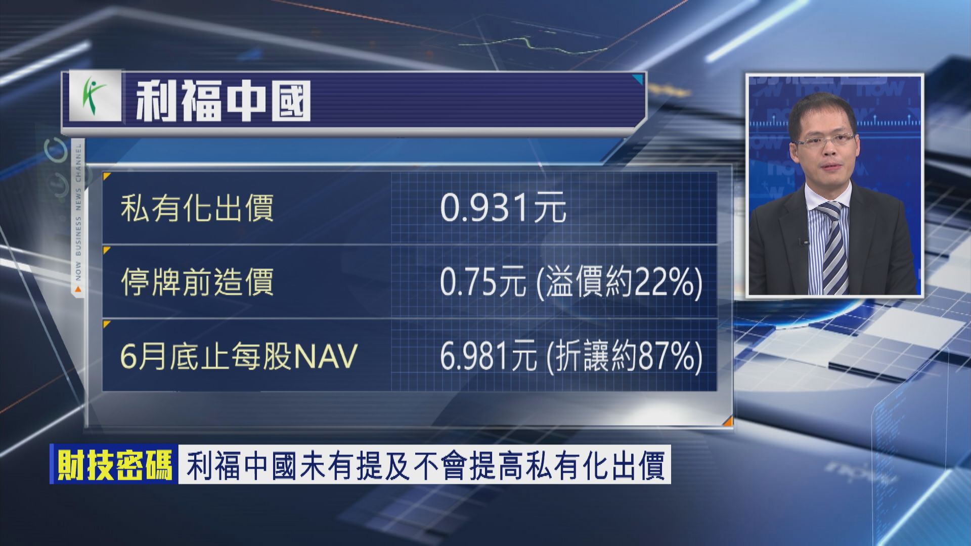 【Now財經台】上周二(3日)開市前宣布停牌嘅利福中國(02136),獲主席兼大股東,人稱「細劉」嘅劉鑾鴻提私有化,每股作價0.913元,較停牌前有逾21%溢價,利福今朝(9日)復牌股價一度大升逾29%,依家係咪私有化嘅好時機,點睇今次嘅私有化出價?