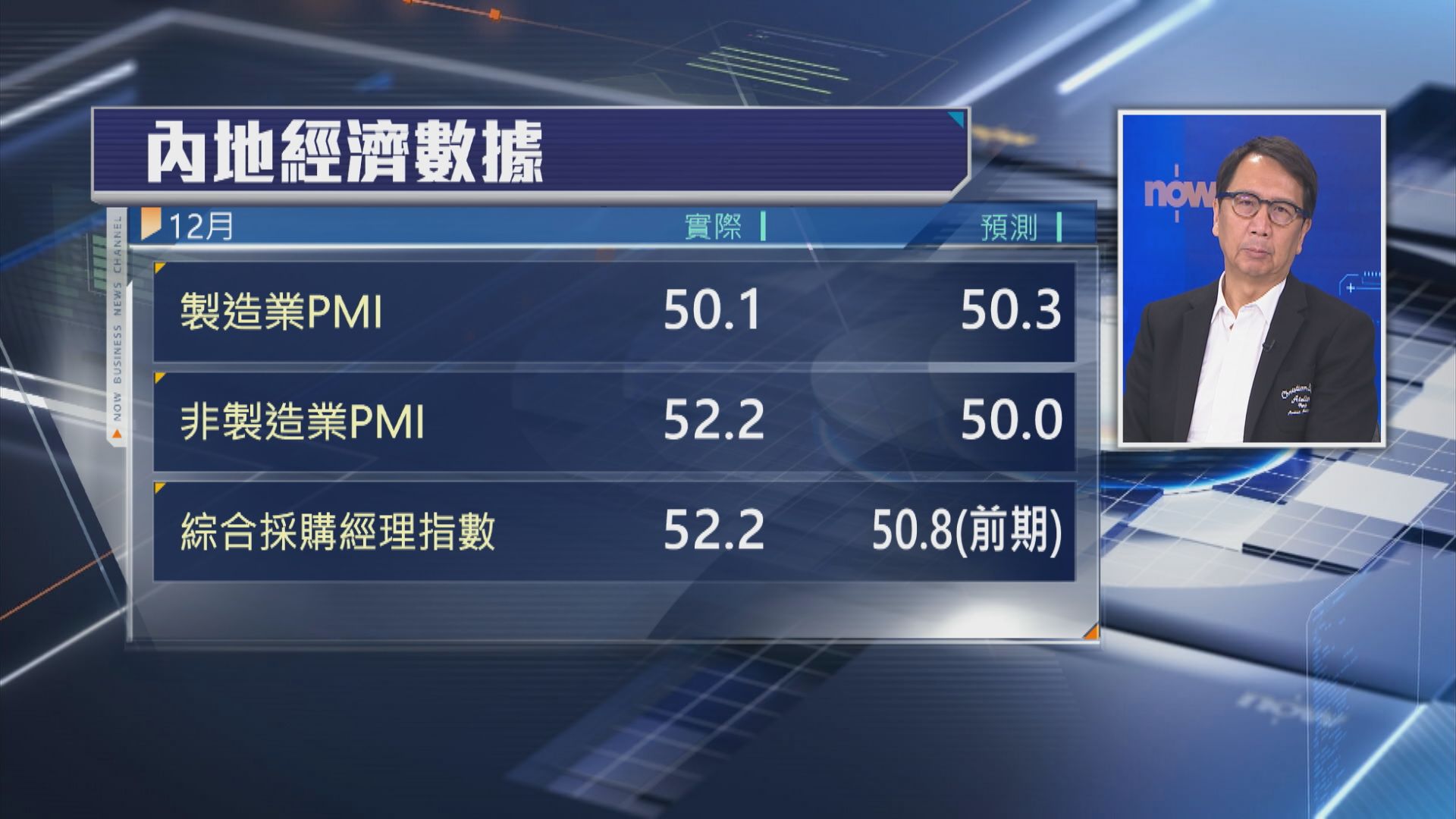 【Now財經台】內地今朝(31日)出咗12月官方製造業採購經理指數(PMI),表現略差過預期,但非製造業商務活動表現就好過預期,應該點解讀呢啲數據?製造業及非製造業表現分化情況係咪會持續?