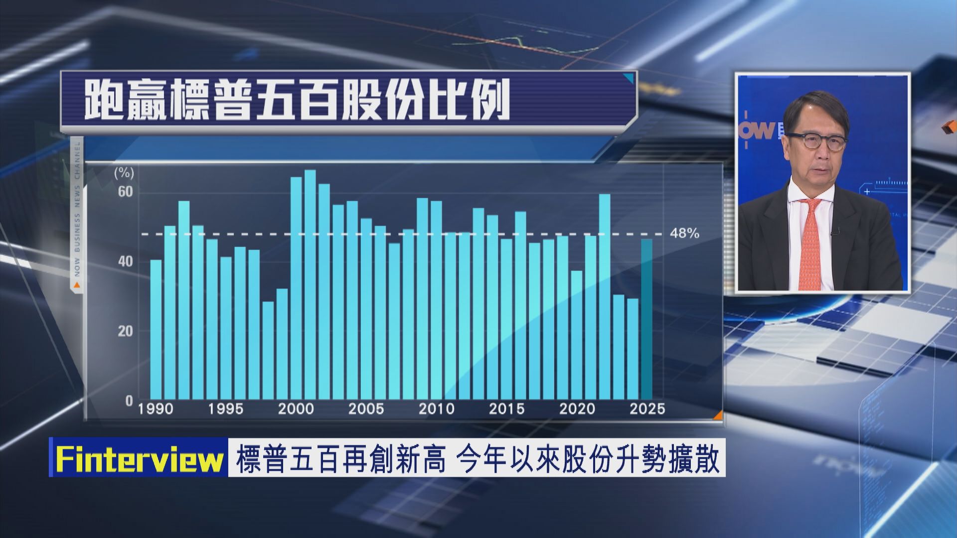 【Now財經台】美股昨晚繼續造好,標普500指數率先破頂。有分析指,今年美股升勢比前兩年分散,今年標普500當中,有46%股份跑贏指數,前兩年大約只有30%,近日亦有明星股於高位大跌,美國後市如何?而資金出現換馬情況,港股是不是好選擇?