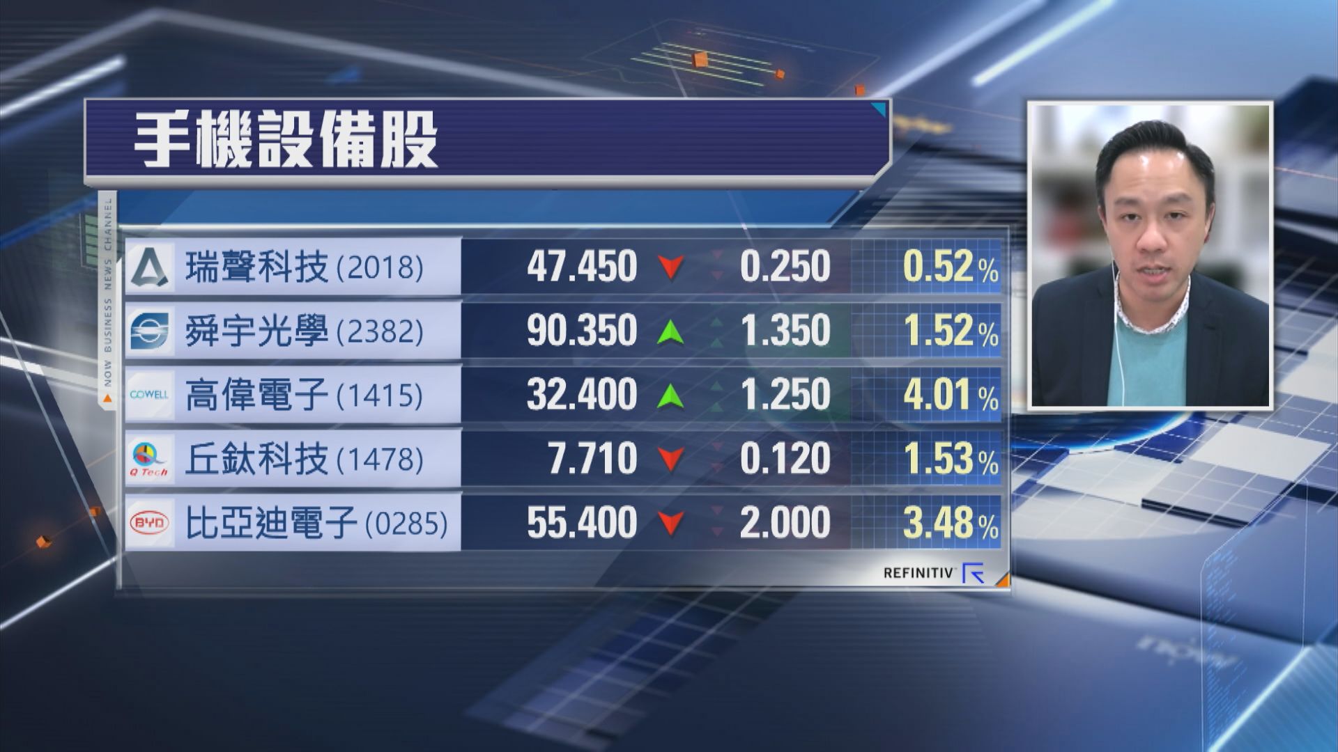 天風國際證券經紀業務部董事李偉傑指,今次投資嘅焦點在於半導體同AI項目,而舜宇等公司主要負責幫Apple做鏡頭、組裝等,所以今日呢類股份冇明顯受壓,暫時未受拖累,政策面亦冇太大壓力,但唔排除將來會有新動作。不過,Apple好難將所有鏡頭或組裝等業務全部搬返去美國,若出現呢個極端情況,其他手機設備股都會受影響。