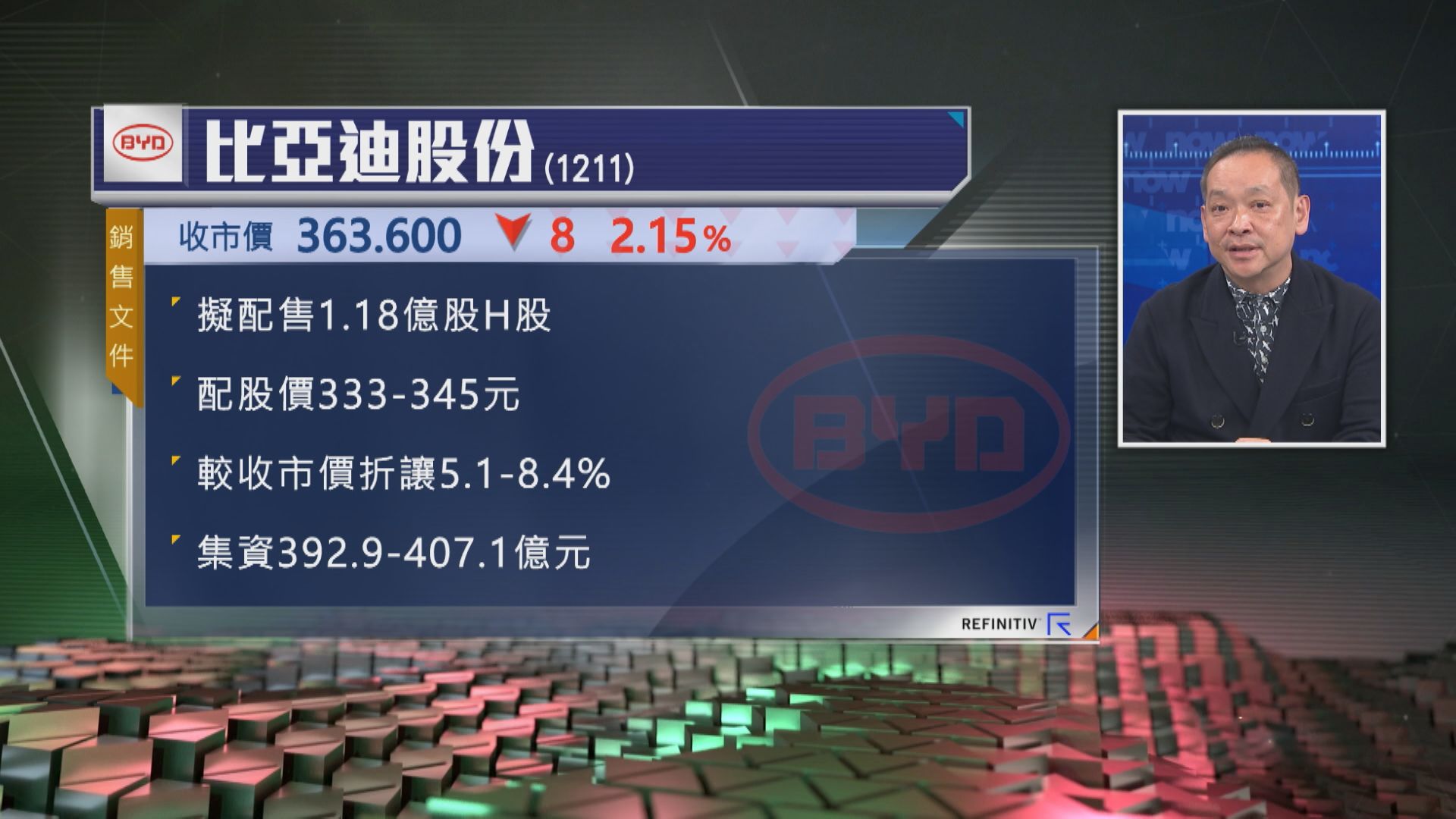 【Now財經台】銷售文件顯示,比亞迪股份(01211)擬配售1.18億股H股,配股價折讓5.1-8.4%,集資約400億元。