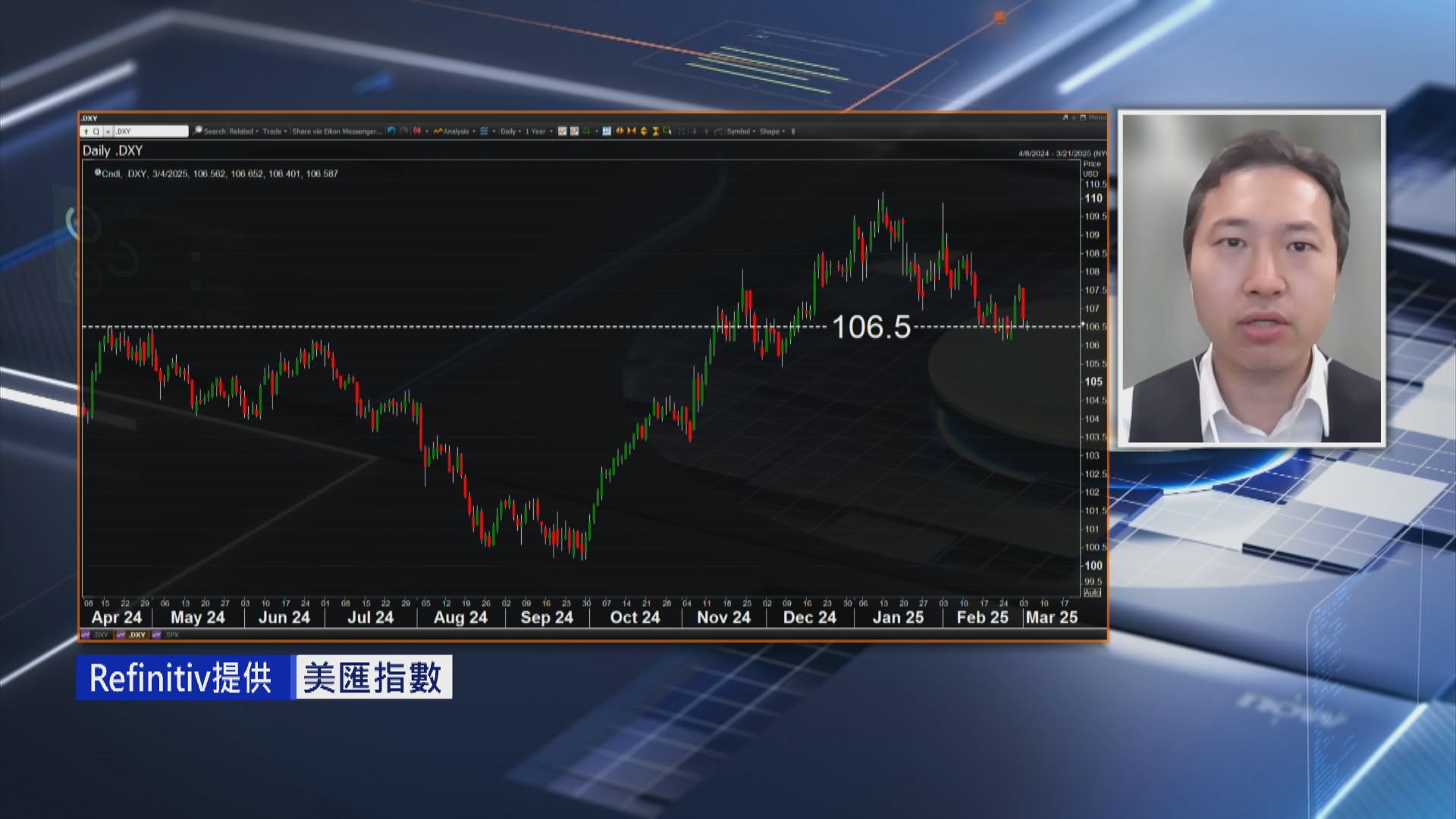 【Now財經台】美匯指數昨日(3日)一度重上107水平,但今日喺美國新關稅生效後急回,落返106.5水平,新關稅生效後,加拿大及中國隨即公布反制措施,徵收報復性關稅,市場已憂慮美國經濟陷入衰退,加上關稅影響唔明朗,對美元走勢有咩影響?