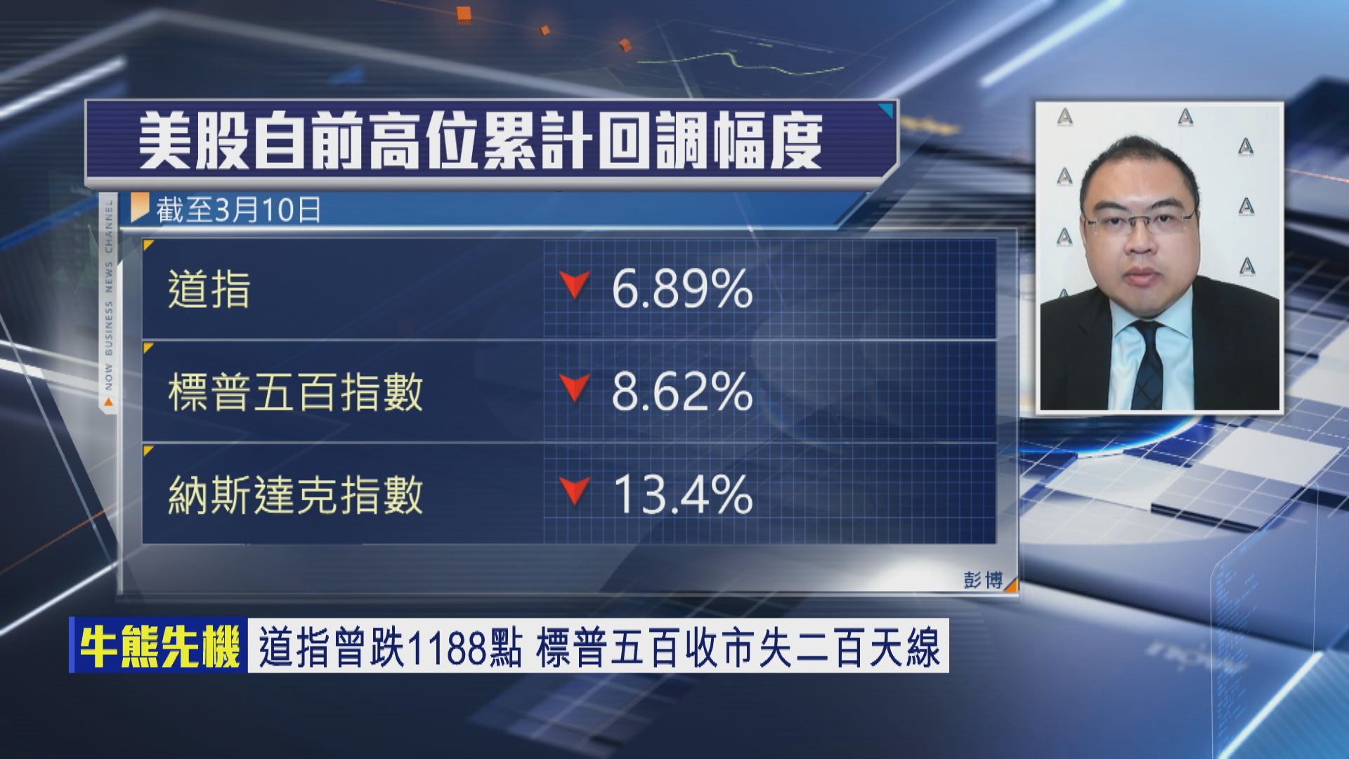 【Now財經台】美股昨晚(10日)經歷「黑色星期一」,3大指數急瀉,道指一度急瀉逾1100點,收市仍跌重挫890點,標指,納指更插4%,錄得兩年半最大單日跌幅,晶片及人工智能(AI)相關股大冧,Tesla收市重挫約15%。市場主要擔心特朗普(Donald Trump)政府或出現政策錯誤,令美國經濟陷入衰退嘅風險急升。
