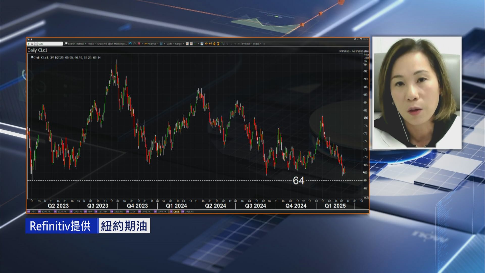 【Now財經台】市場對中美經濟憂慮齊升溫,2月內地居民消費價格指數(CPI)跌0.7%,相隔逾1年再陷入通縮,美國非農就業數據表現亦強差人意,美國總統特朗普(Donald Trump)對經濟衰退問題避而不談,油價本身已有唔少負面因素,下個月又要面臨石油輸出國組織及盟友(OPEC+)增產,雖然美國能源部長Chris Wright指,特朗普準備執行針對伊朗嘅石油制裁,但紐約期油仍要考驗每桶65美元支持,後市有冇條件企穩?