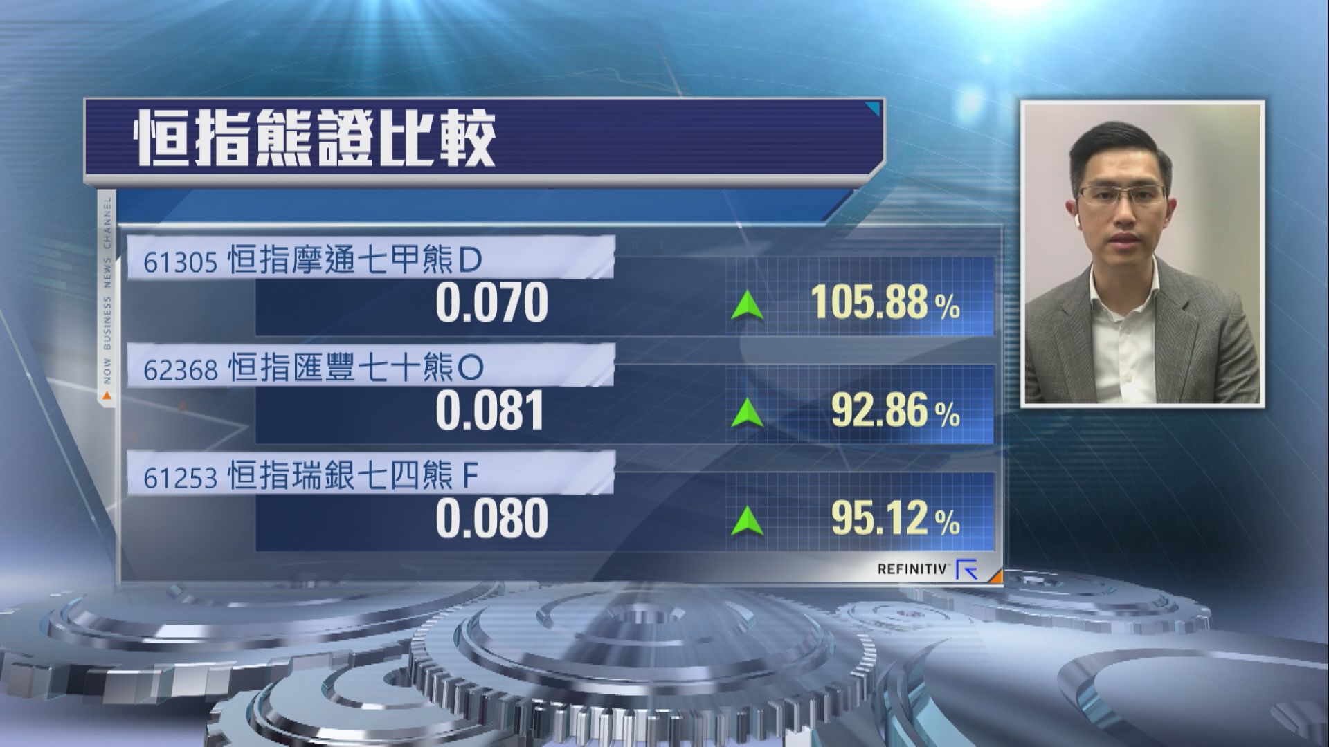 【Now財經台】港股今早(13日)回套,恒生指數低開55點後,跌幅不斷擴大,一度低見23190點,瀉逾350點。牛證重貨區上移至約23200點,有872張嘅相對期指部署,其中22700點係最多人加倉位置,熊證新重貨區喺23700點,有近400張相對期指部署。恒指連升8個交易日後終於要回一回氣,昨日(12日)抽升逾600點,好友紛紛食糊,今朝好淡友都較進取,如果收回價距離現價約500點,合唔合適?