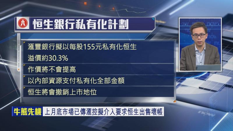 【Now財經台】滙豐控股(00005)建議私有化恒生銀行(00011),每股作價155元,較昨日(8日)收市價119元,有約30%溢價,按私有價計,恒生市帳率(PB)1.8倍,現時行業PB中位數僅約0.4倍,反映滙控出手非常闊綽,但30%溢價對呢家本地老字號銀行嘅小股東嚟講吸唔吸引?點睇今次私有化?