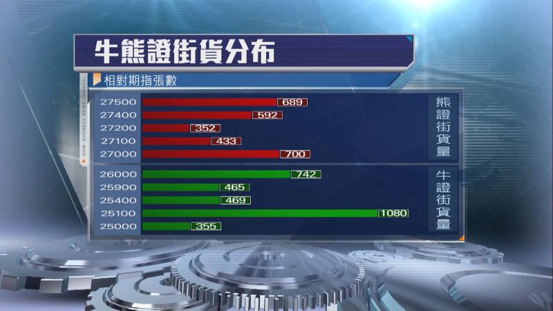 元宇證券基金投資總監林嘉麒指,大市上星期去返100天線,見到恒指出現反彈,有部分投資者選擇加倉,26000點係一個大關口,亦係上周裂口支持底部,今輪反彈有機會上到27000點,甚至10月高位27300點,所以熊證部署喺呢個水平都好合理。