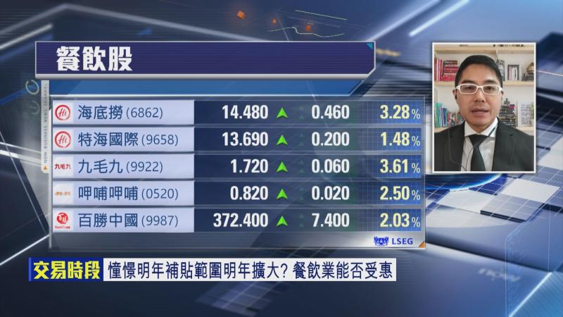 【Now財經台】中央經濟工作會議提出明年8大重點任務,其中,谷內需成為首要任務,提及要優化「兩新」政策實施,即設備更新及「以舊換新」,有分析估計,補貼範圍有機會擴大,餐飲股今日(12日)炒上,係咪憧憬餐飲業會獲得補貼?