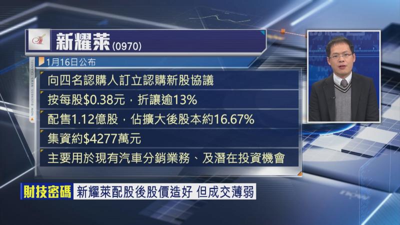 【Now財經台】新耀萊(00970)上星期五(16日)收市後公布折讓配股消息,計劃以每股作價0.38元向4名承配人發行約1.12億股,折讓近14%,佔擴大後股本超過16%,集資4200多萬。股價有得升,但成交不多,股價表現能否作為市場對交易看法的參考?