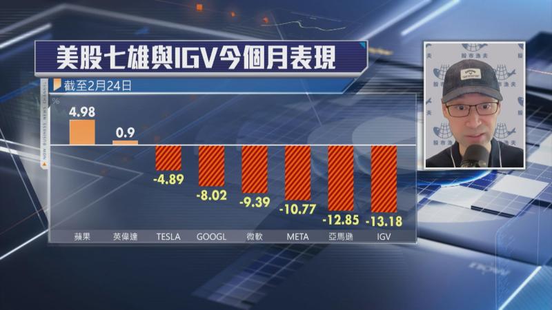 「股市漁夫」創辦人莊志雄指,美股由上年開始已經跑輸其他市場,今年情況再差啲,指數亦冇乜表現,多個板塊都跌得好勁,尤其係「科技7雄」(Magnificent 7)、軟件股,依家只係靠半導體、軍工及防守股頂住個市,佢相信呢個情況會持續。