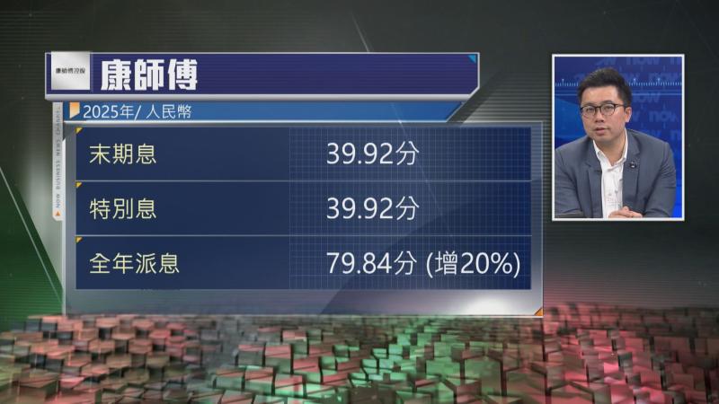 【Now財經台】康師傅控股(00322)去年收入跌2%,但純利增加兩成,賺45億人民幣,派末期連特別股息合共79.84分,按年增加兩成。華富建業證券投資策略聯席總監阮子曦指,康師傅業績穩健,派息比率持續達100%,股息率計達7厘,屬於吸引。集團去年整體毛利率升1.7個百分點去到34.8%,由於中東戰事勢推高原材料成本,相信未來毛利率會面對壓力,今年業績估計難及去年。阮子曦相信,康師傅估值重估空間有限,但高息率有利支持股價。