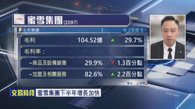 天風國際證券研究部主管李偉傑指,蜜雪呢份成績表有驚喜,尤其去年下半年收入及盈利增速都比之前好,令市場信心大增,雖然整體毛利率微跌,但加盟店毛利率表現仍然理想,蜜雪本質上都係靠龐大嘅加盟網絡,維持高毛利及高盈利增速,現時加盟店表現理想,可以抵禦到內地市場嘅「內捲」壓力。