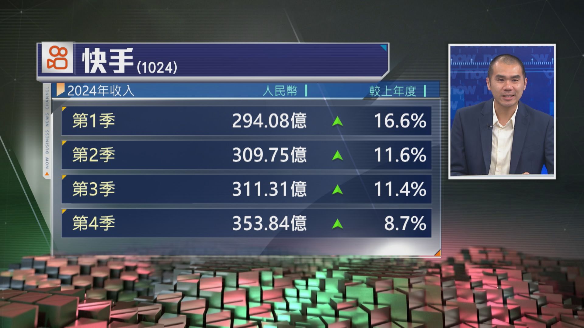 【Now財經台】快手(01024)去年第四季收入升8.7%,經調整盈利升7.8%,符合市場預期。