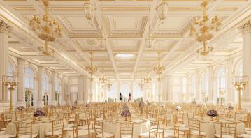 宴會廳內部也以新古典主義風格為核心,三面設典雅的拱形窗戶,搭配古希臘科林斯式(Corinthian)樑柱,天花板及牆面襯以金色飾邊,構築氣派優雅的聚會空間。落成後將可同時容納約650名賓客,相較現有白宮東廳的200人,大幅提升。