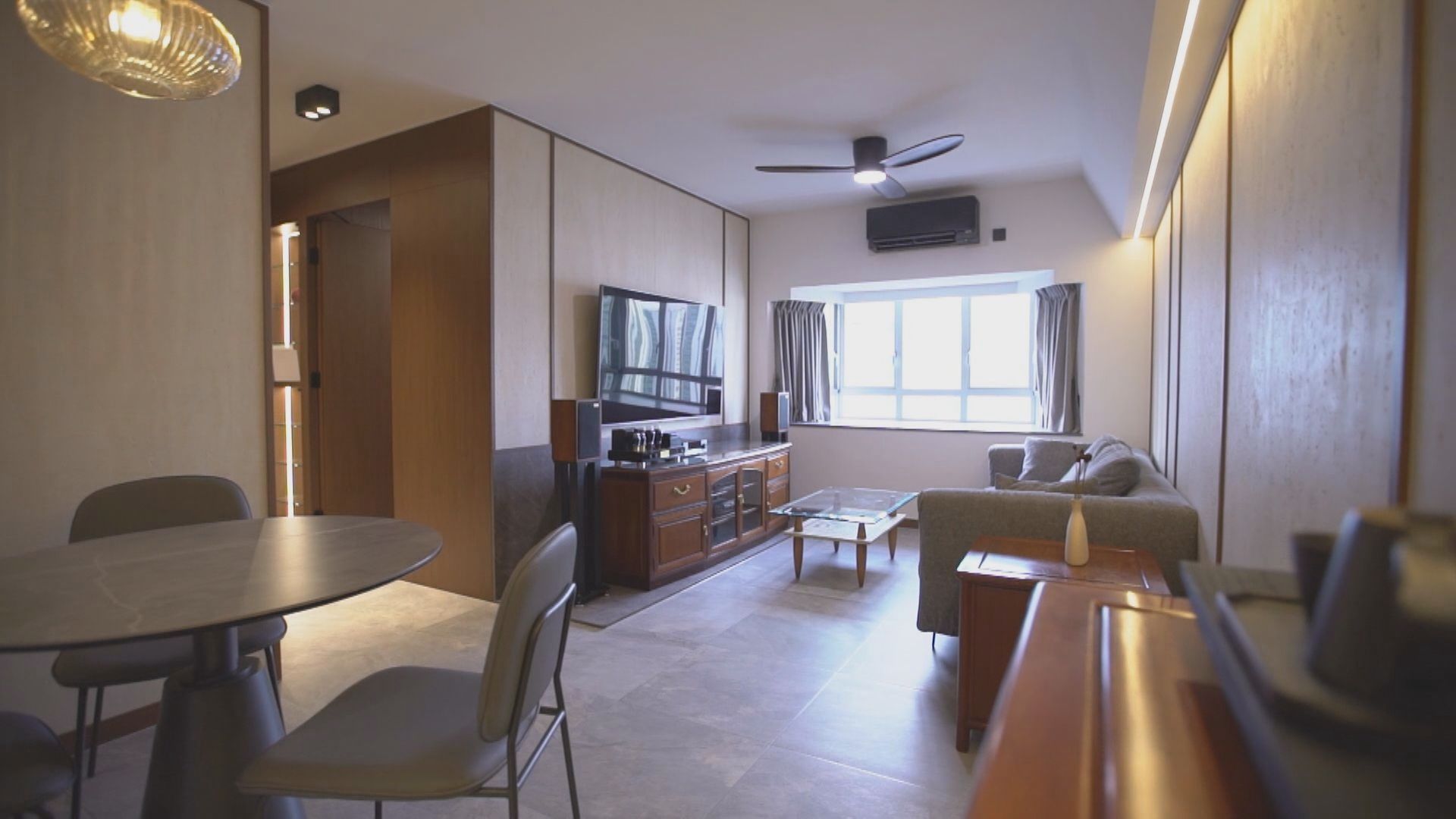 【Now財經台】全屋採用統一物料天然洞石板,配搭深木色,加入屋主的原有的古董傢俬,營造現代復古風格。