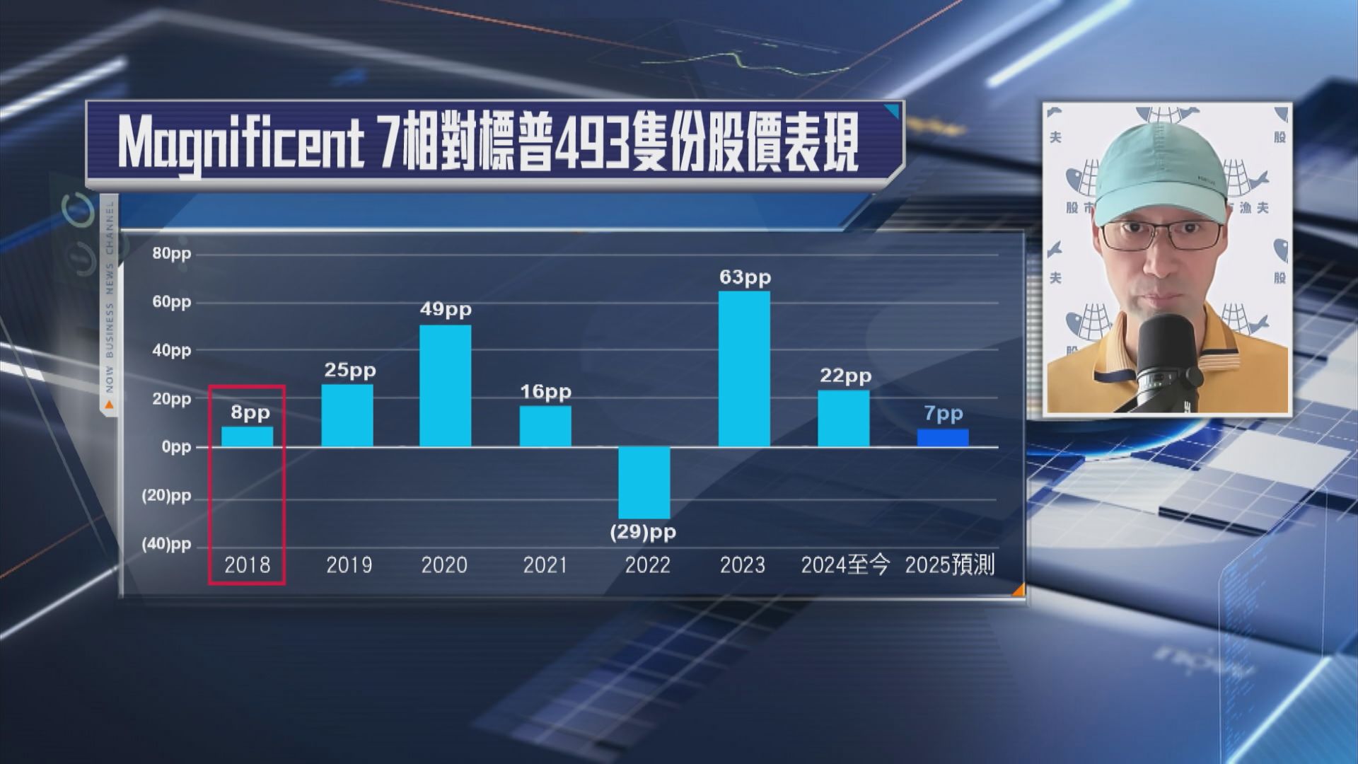 【Now財經台】美股今年表現強勁,標普500指數累升約25%,主要係靠大股撐起整個升勢,高盛估計,相比標指其他股份嘅股價,明年「科技7雄」(Magnificent 7)跑贏幅度將唔及今年及去年咁勁,估計只會跑贏7個百分點,而上一次出現相若情況係2018年,相比2018年,依家嘅情況係好咗還是更差?