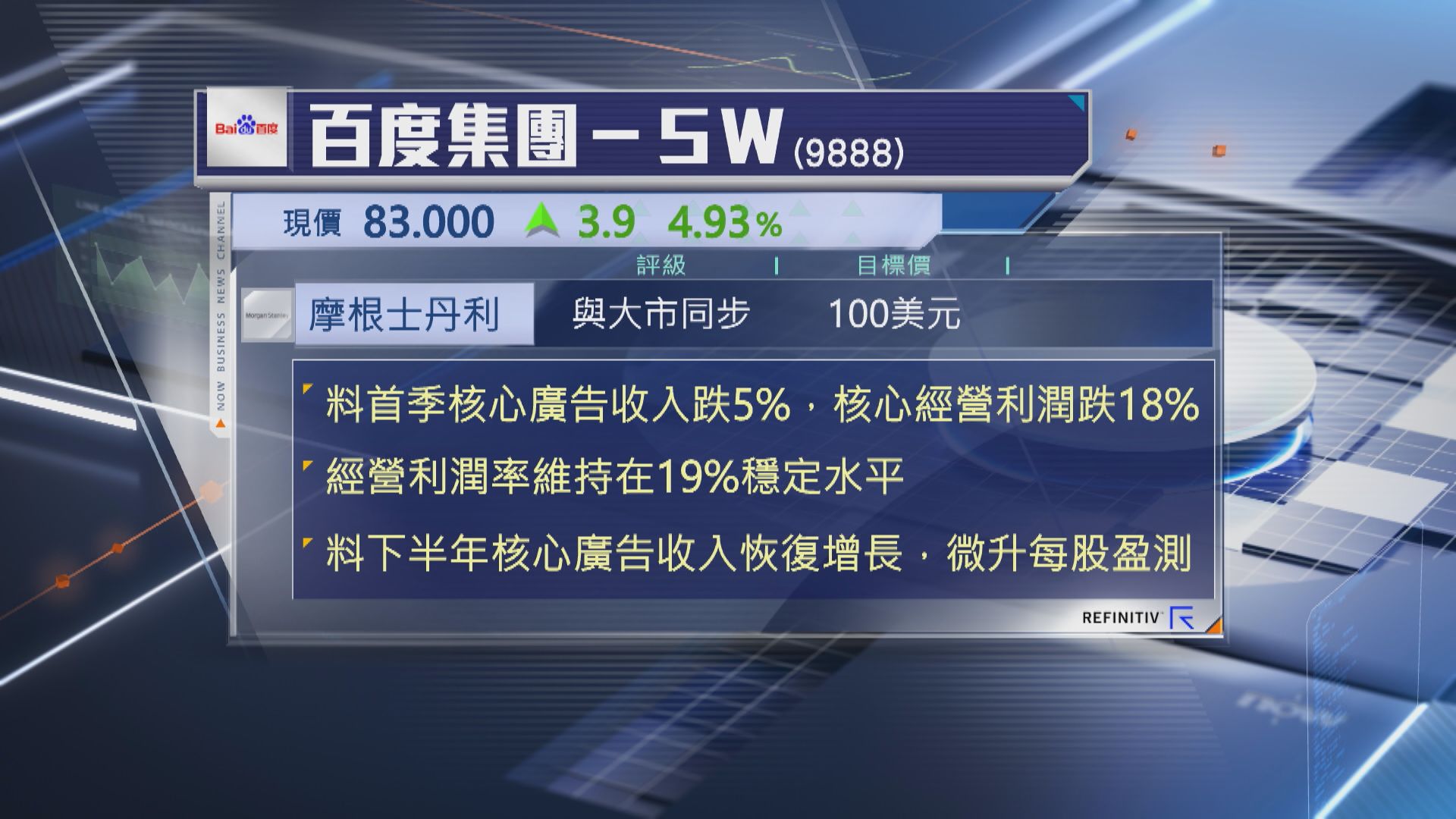 【Now財經台】摩根士丹利預期,百度集團(09888)首季業績按年倒退。