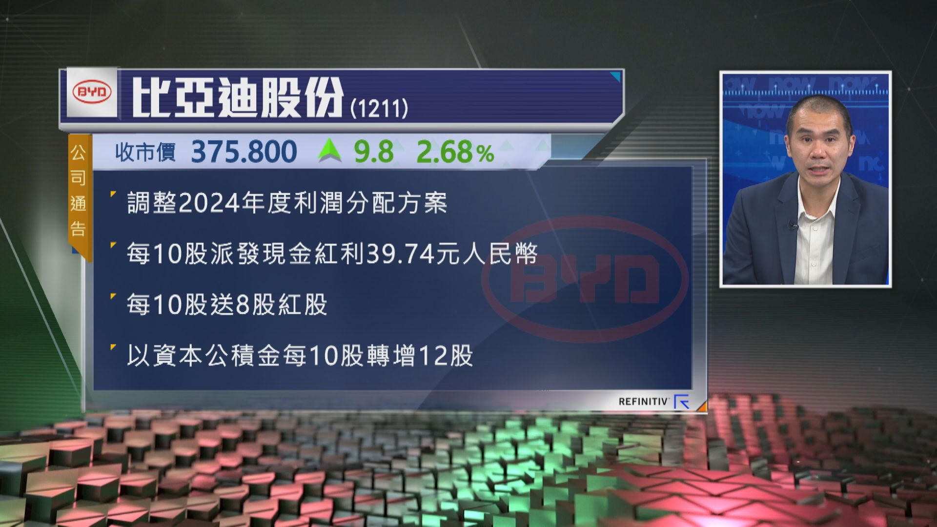 【Now財經台】比亞迪股份(01211)建議10股送8股紅股,原因是與投資者分享公司經營成果,優化股本結構,提升投資者獲得感。