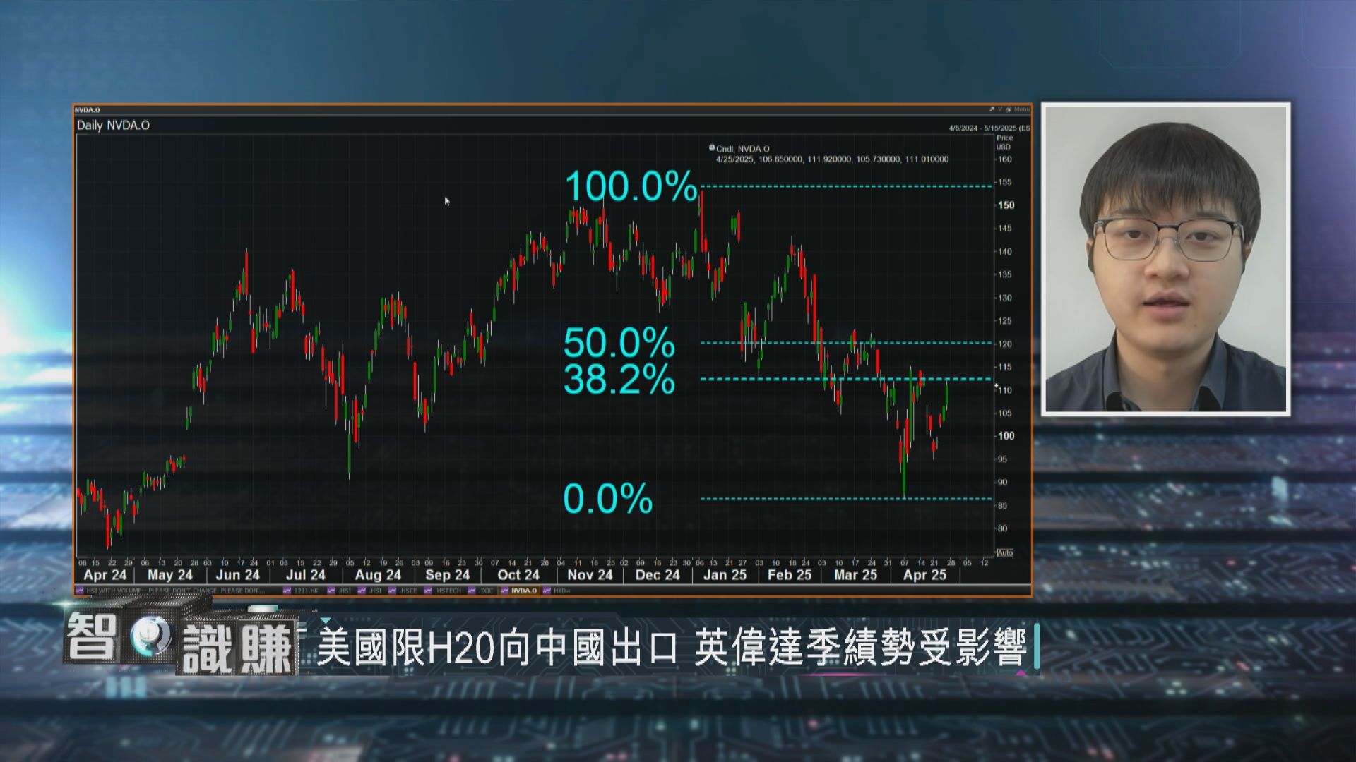 【Now財經台】美股反彈,當中納斯達克指數「拉出」黃金比率,反彈至0.5水平,但英偉達(Nvidia)就跑輸大市,只反彈至0.382水平!中美貿易戰下,Nvidia原本為中國市場設計的H20晶片被限制出口後,公司下月底公布的業績會否受到影響?