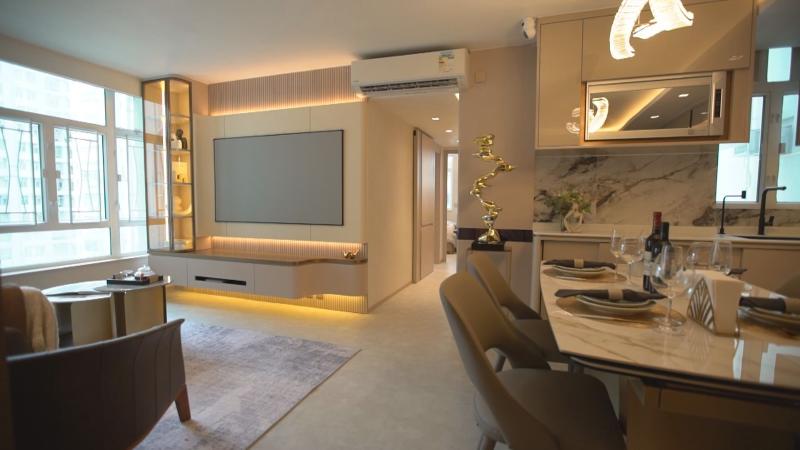 【Now財經台】一個面積近700平方呎的單位,採用大量圓角傢俬及高光亮面焗漆,增強視覺空間,並重劃3房呂字廳間隔,打造舒適的長者居住空間。