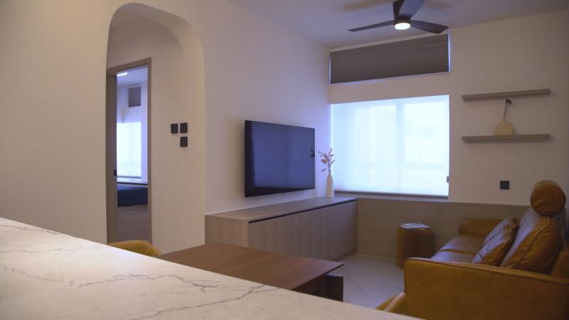 【Now財經台】全屋以木色為主調,在不同的位置加入特色圖案和瓷磚點綴,並利用傢俬去修飾原則缺點,加強空間感。