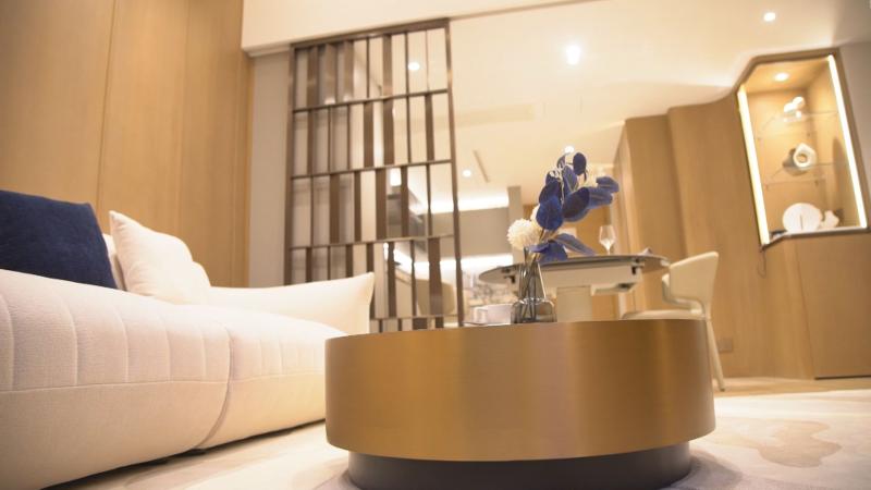 【Now財經台】服務式住宅在不能改動間隔下,設計師以訂造傢俬及配襯飾面融入雲石、鋼材作點綴,營造奢華酒店風。