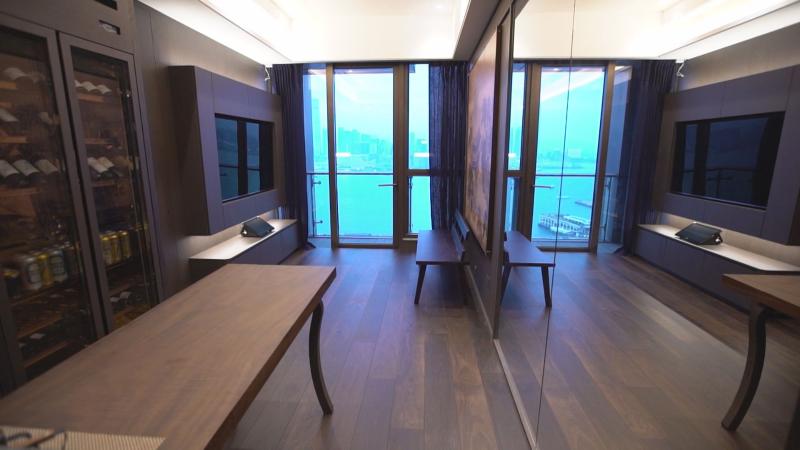 【Now財經台】運用較深色調設計,全屋傢俬加入中式線條及木材,營造復古風格。此外,為配合屋主喜好,打造了酒吧區及視聽區。