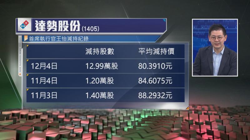 【Now財經台】達勢股份(01405)執董兼首席執行官(CEO)王怡,過去一個月三度減持股份,沽出的股數越來越多,但減持價則越來越低。
