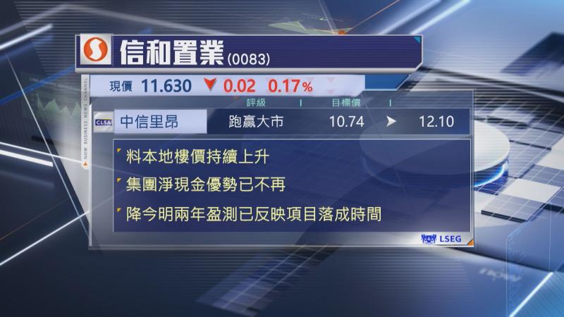 【Now財經台】本港樓市復甦,中信里昂指出,信和置業(00083)淨現金狀況已不再具有優勢。