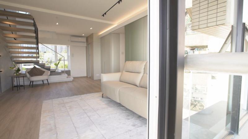 【Now財經台】為擴大全屋空間,戶主將上下兩個單位打通,變成複式單位,設計以淺灰色及蘋果綠色作主調,並加入木系元素,營造現代簡約風格。