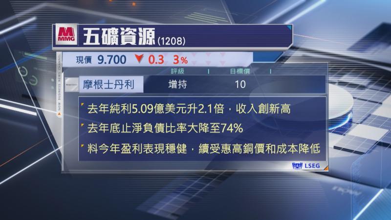 【Now財經台】五礦資源(01208)去年賺逾5億美元,按年大升2倍,摩根士丹利表示,純利達指引中位數。