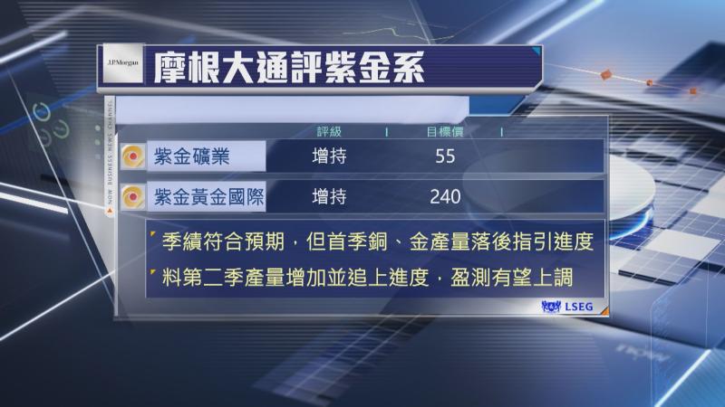 【Now財經台】紫金礦業(02899)及紫金黃金國際(02259)公布首季業績,摩根大通預計,紫金礦業股價反應正面,維持兩隻股份「增持」評級,未有調整目標價。