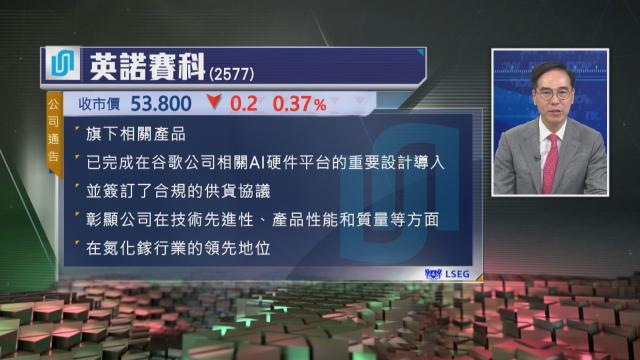 【Now財經台】英諾賽科(02577)的產品完成在谷歌相關AI硬件平台的重要設計導入,並簽訂供貨協議。
