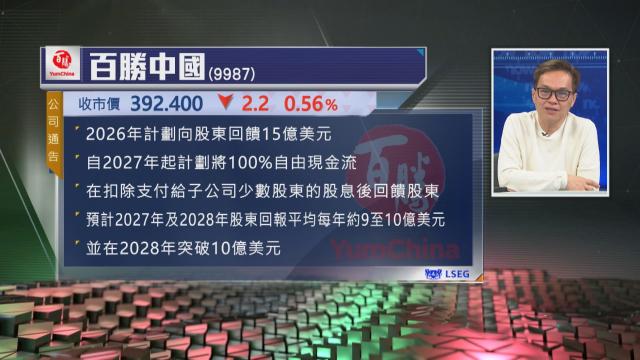 【Now財經台】百勝中國(09987)第四季純利增長21.7%,勝預期,並重申2027-2028年股東回報每年約9-10...