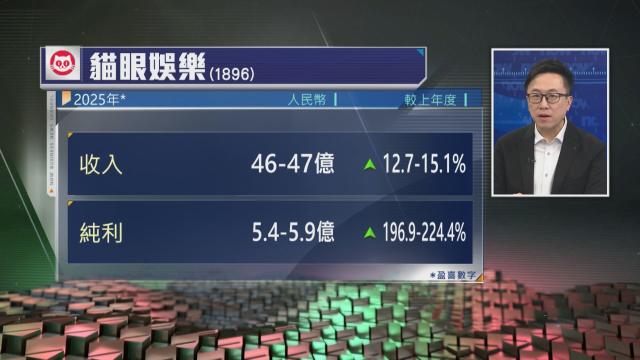 【Now財經台】貓眼娛樂(01896)預期,去年純利介乎5.4-5.9億元人民幣,按年增長2-2.2倍。