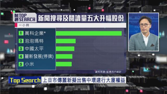 【Now財經台】截至早上11時止,1小時內《彭博》搜尋量最多港股,依次為泡泡瑪特(09992)、萬科企業(02202)、...