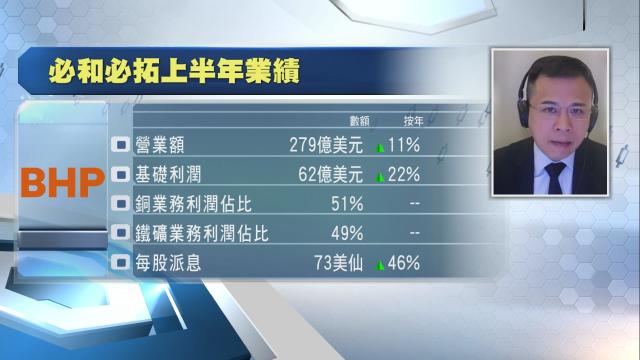 【Now財經台】礦業巨頭「必和必拓」(BHP AU),上半年營業額達279億美元,按年增長一成,而基礎利潤就增兩成,至6...