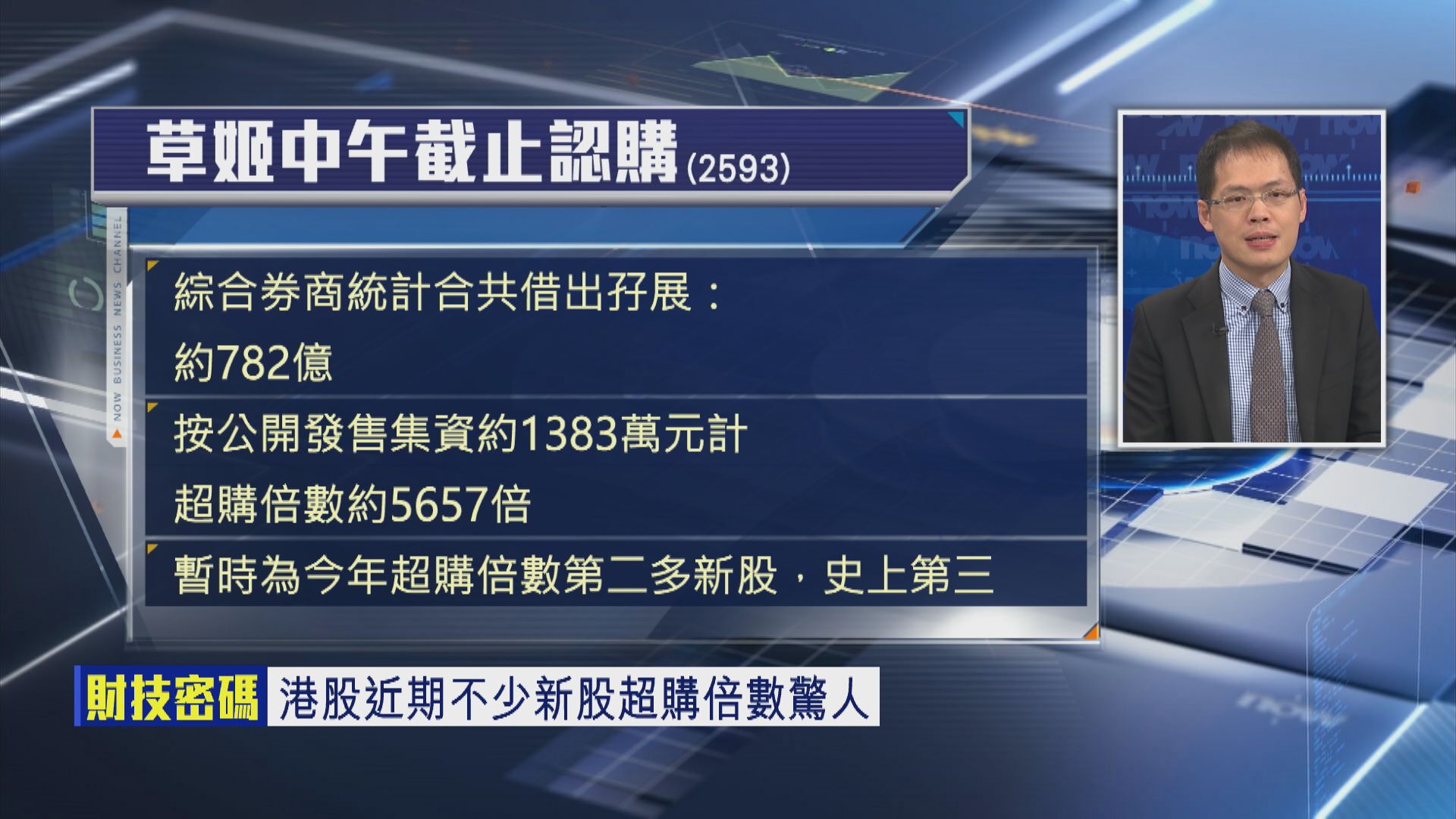 【Now財經台】草姬集團(02593)公開招股今午(16日)截飛,綜合券商最新數字,暫時接咗約782億元,公開發售暫時超購約5657倍,暫時已經係歷來新股「超購王」No.3,如果今日「最後衝刺」成功,有機會挑戰史上No.2兼今年「超購王」晶科電子(02551)超購5677倍嘅紀錄。除咗有「視帝」郭晉安嘅明星效應加持,草姬招股反應熱爆仲有咩原因?