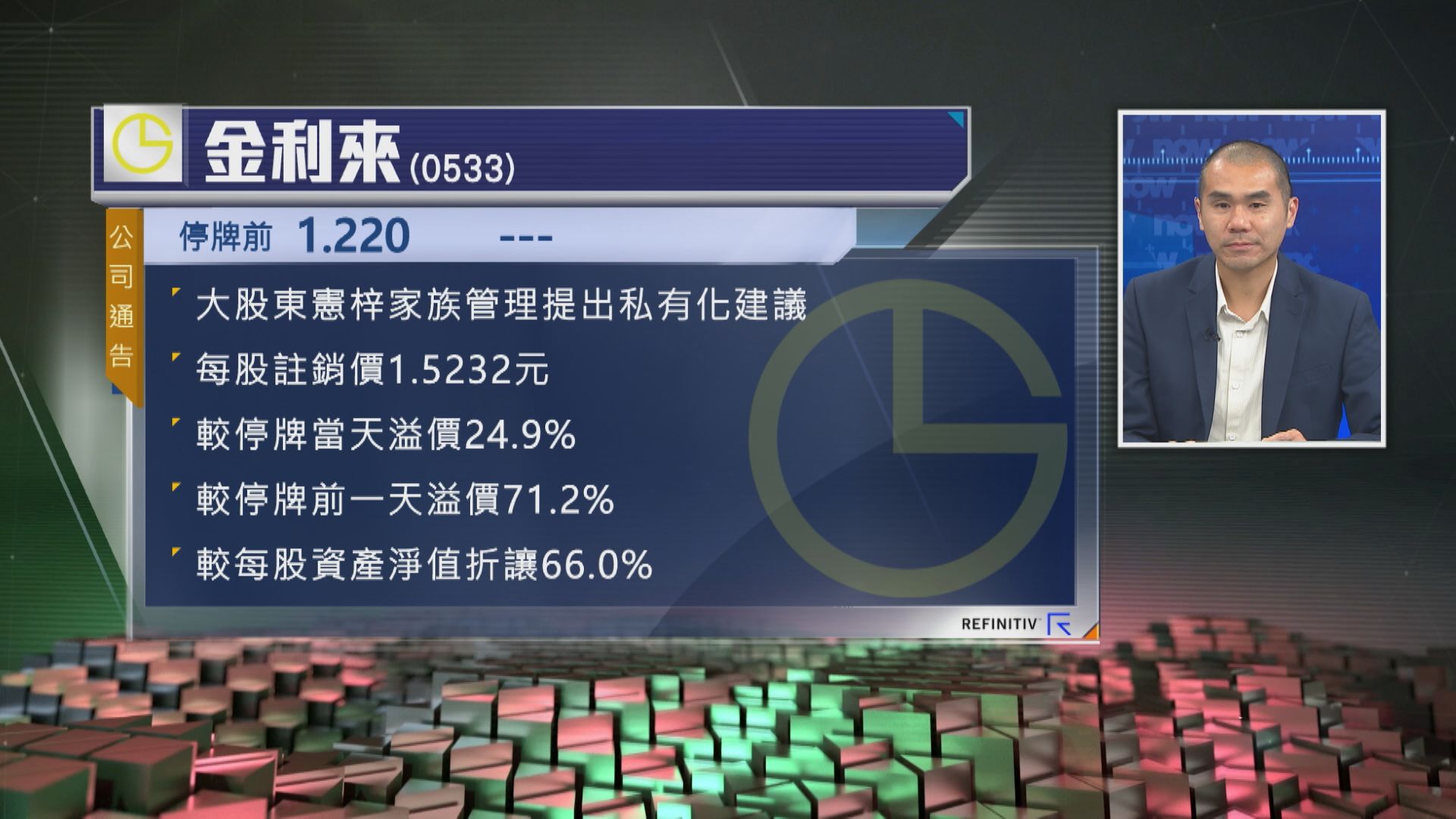 【Now財經台】金利來(00533)獲大股東提出私有化,每股註銷價1.5232元,較停牌前一天溢價71.2%。