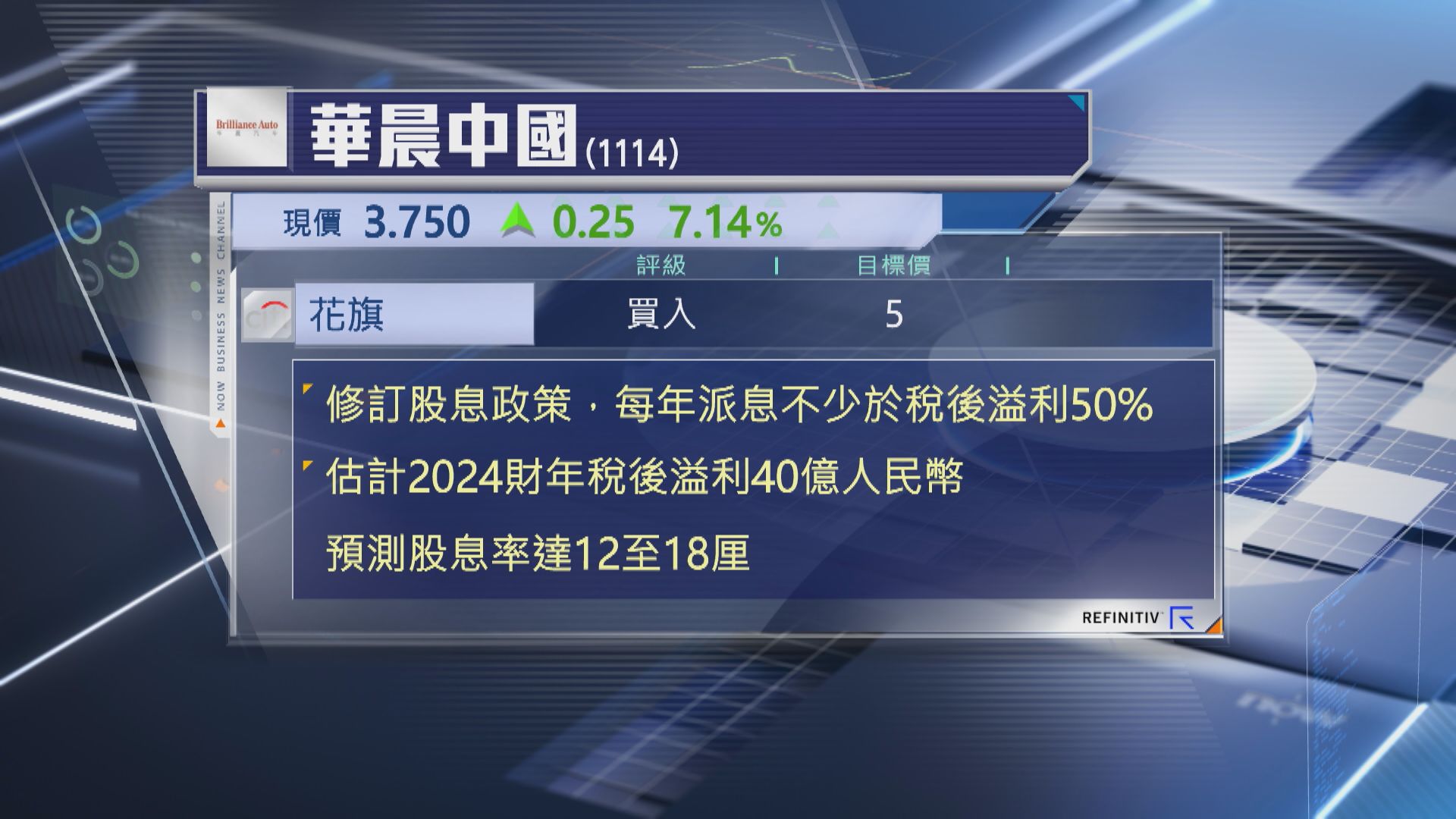 【Now財經台】花旗表示,華晨中國(01114)定下每年派息不少於稅後溢利50%,高於市場預期。