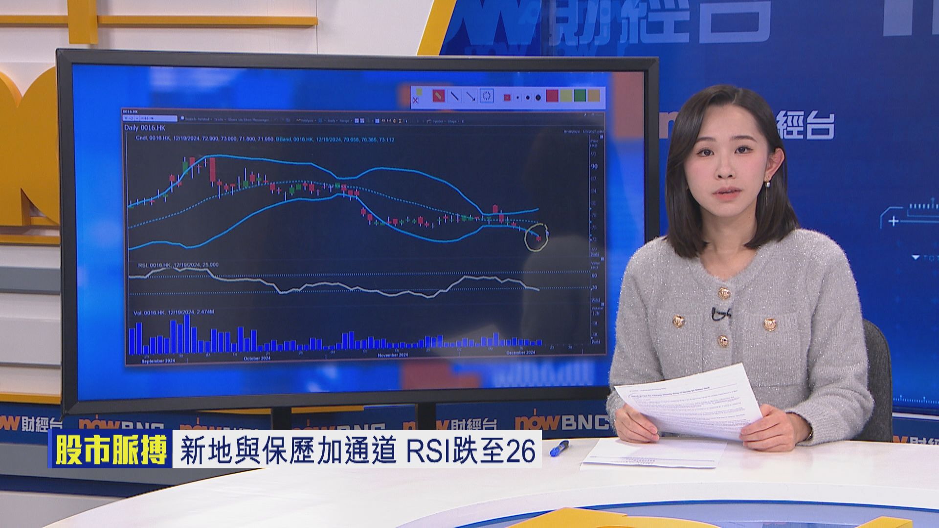 睇返技術走勢,新地股價今日已失守保歷加通道,相對強弱指數(RSI)落到26水平,係最超賣藍籌,新地係地產股,一定對息口敏感,美國明年好大機會放慢減息步伐,都預咗股價有較大反應,其實新地股價月初已開始跌,自近期高位80元水平,累計回落10%,表現跟同業恒基地產(00012)、長實集團(01113)差唔多。