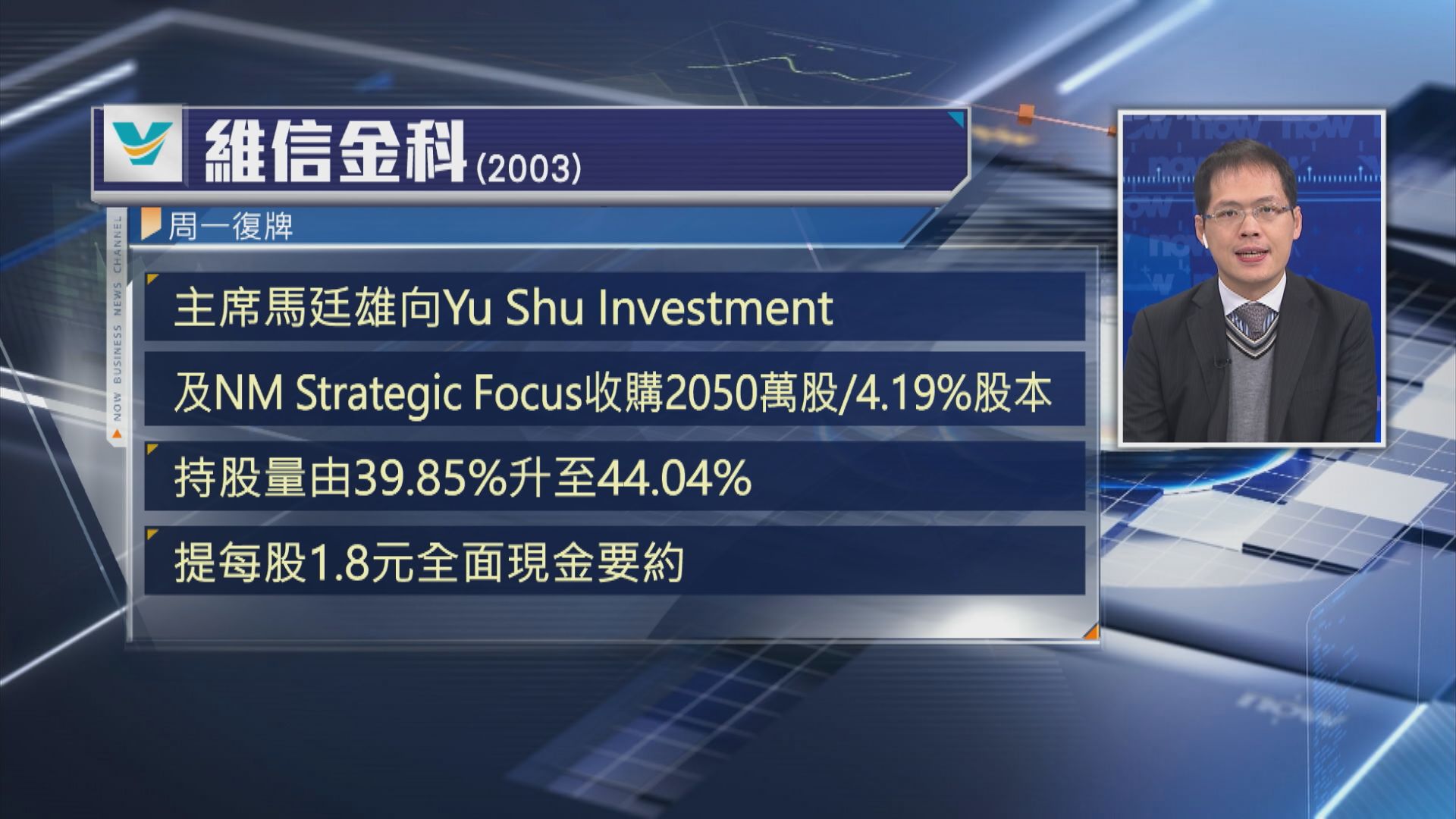 【Now財經台】維信金科(02003)今早(23日)復牌,主席馬廷雄因增持而觸發技術性全購,收購價每股1.8元,較停牌前有約9%折讓,係咪反映大股東唔想私有化公司?公司近年業績轉差,主席仍繼續增持,係咪佢睇好公司經營前景會好轉?