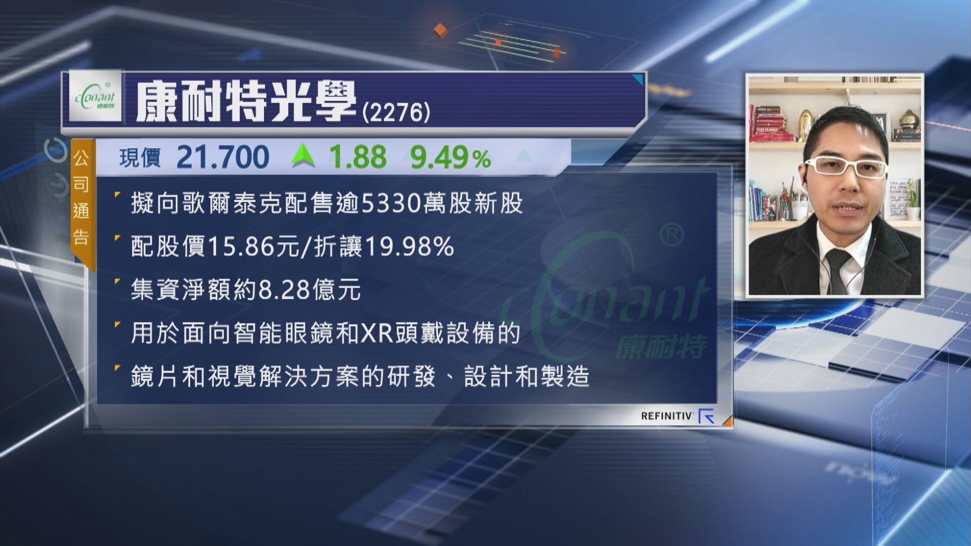 【Now財經台】康耐特光學(02276)擬以每股15.86元,配股畀歌爾子公司,配股價較上周五(20日)收市價折讓約20%,消息公布後,康耐特股價今日(23日)不跌反升,引入歌爾子公司後,康耐特業務會唔會變得多元化?歌爾又會唔會進一步擴展光學業務?