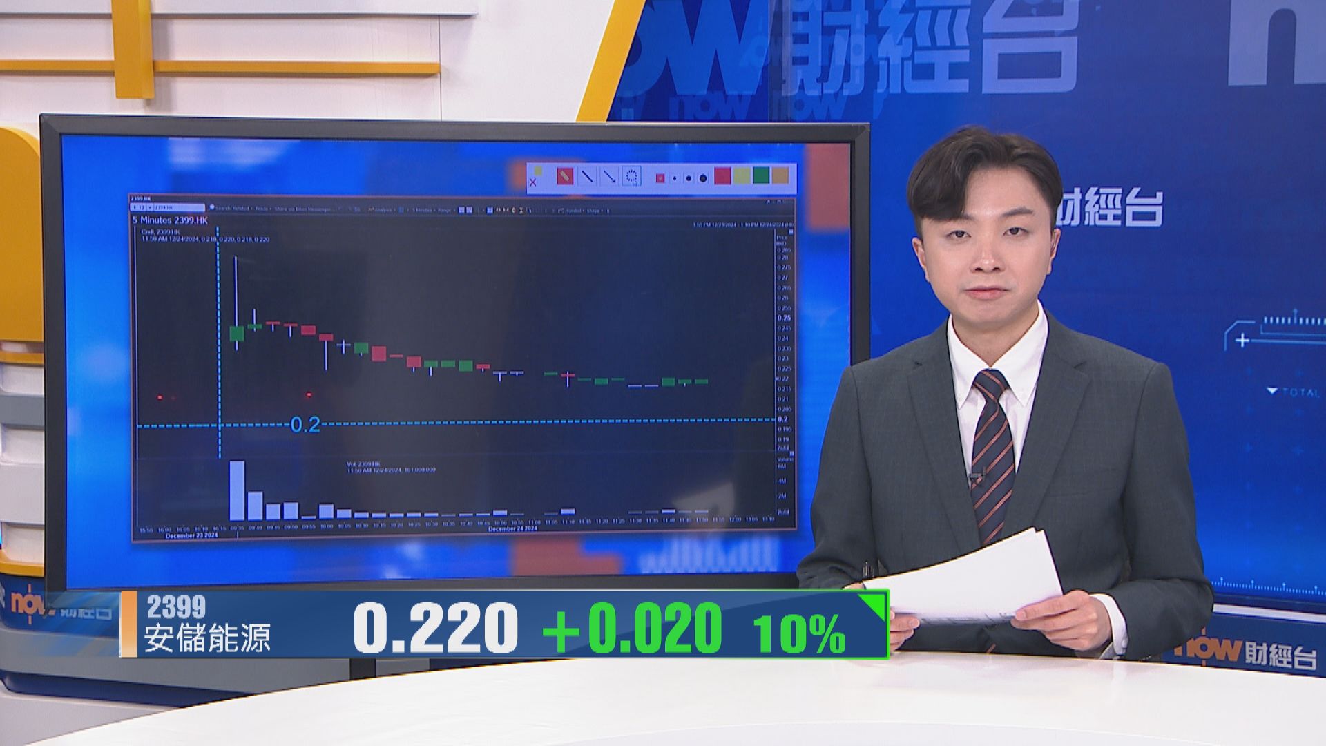 【Now財經台】中國安儲能源(02399)股價今早(24日)裂口高開15%後,短短5分鐘內,股價已炒高40%,但其後升幅顯著收窄,成交股數較過去100日同時段平均大增17倍。
