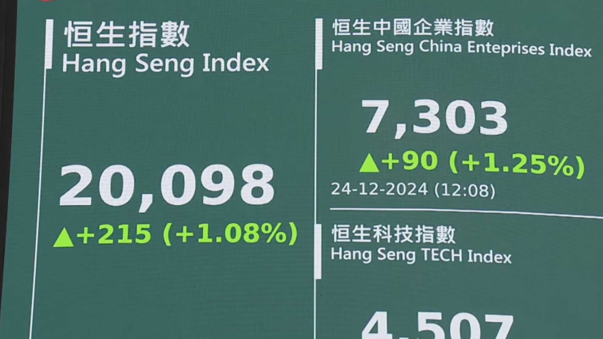 平安夜港股只得半日市,但無阻大市升勢,恒指連升第2日,趕及聖誕節前收復20000關。