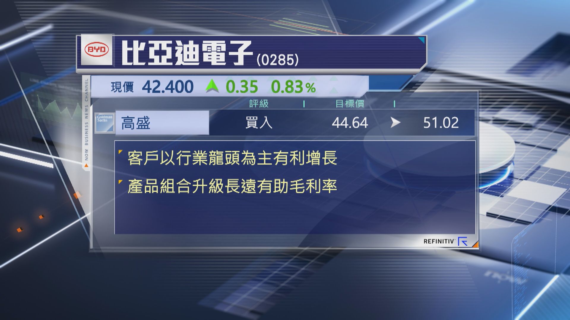 【Now財經台】高盛上調比亞迪電子(00285)目標價,由44.64元調高至51.02元,維持「買入」評級。