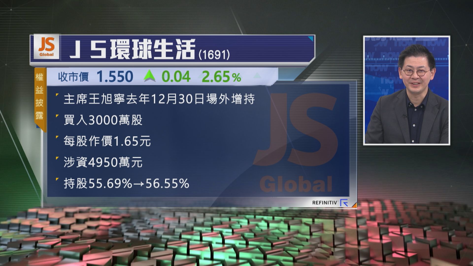 【Now財經台】權益披露顯示,JS環球生活(01691)主席兼大東王旭寧於上月30日,場內以溢價近28%增持0.3億股。