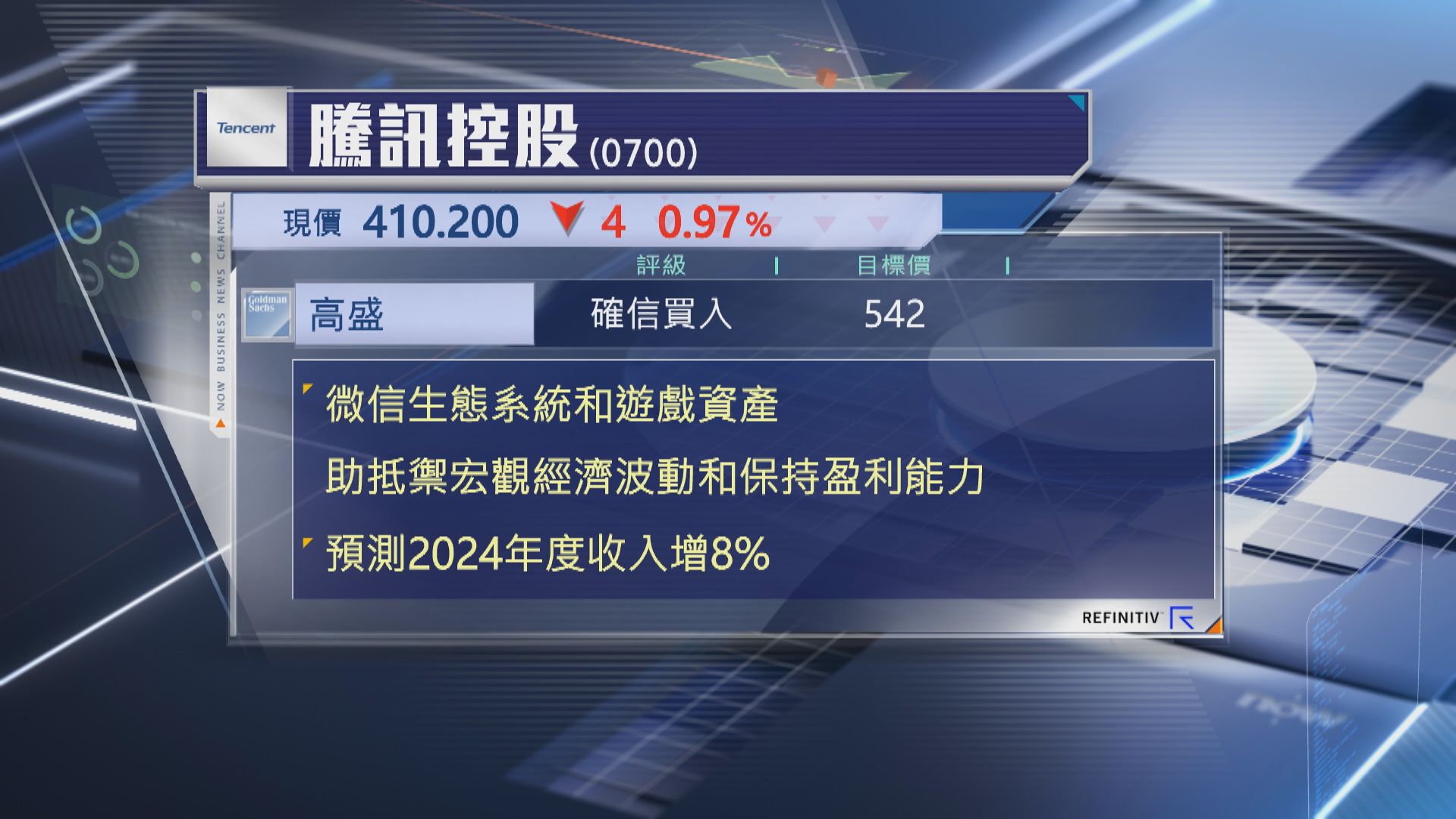 【Now財經台】高盛維持給予騰訊控股(00700)「確信買入」評級,以及目標價542元不變。